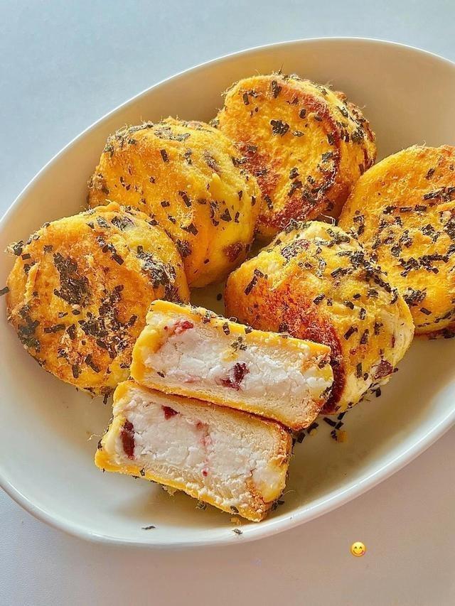 Lightly spread a thin layer of yogurt on the surface of each fried toast bite. Then roll it in the meat floss and seaweed mixture until coated.